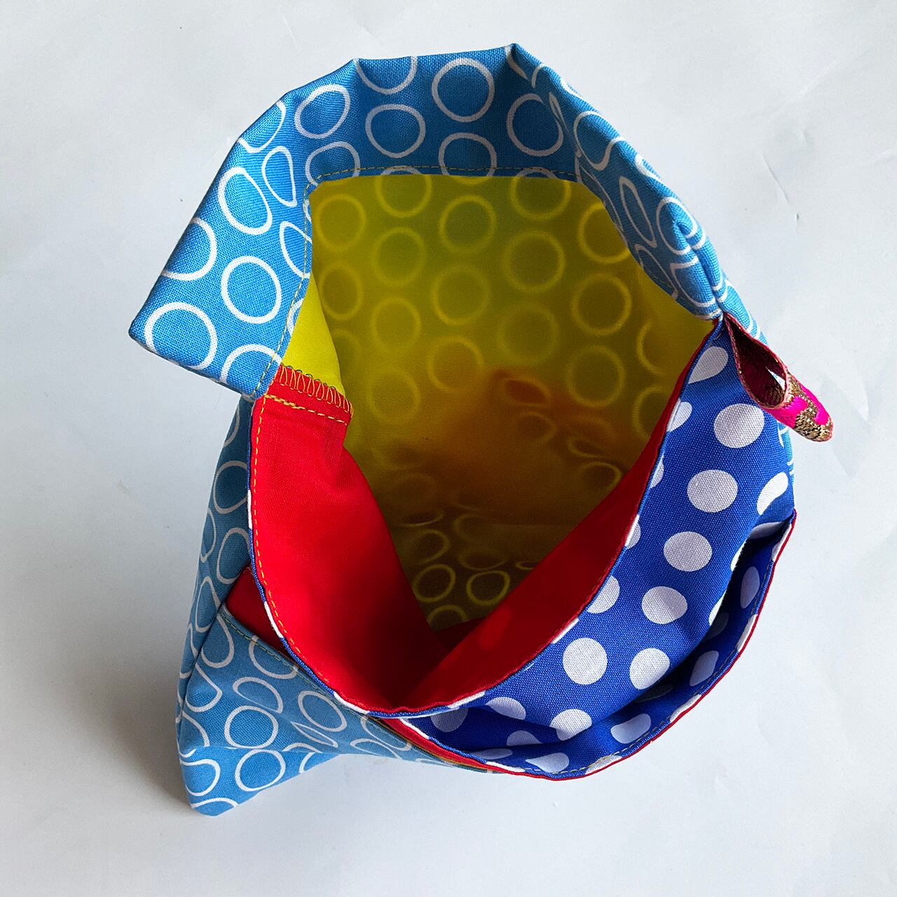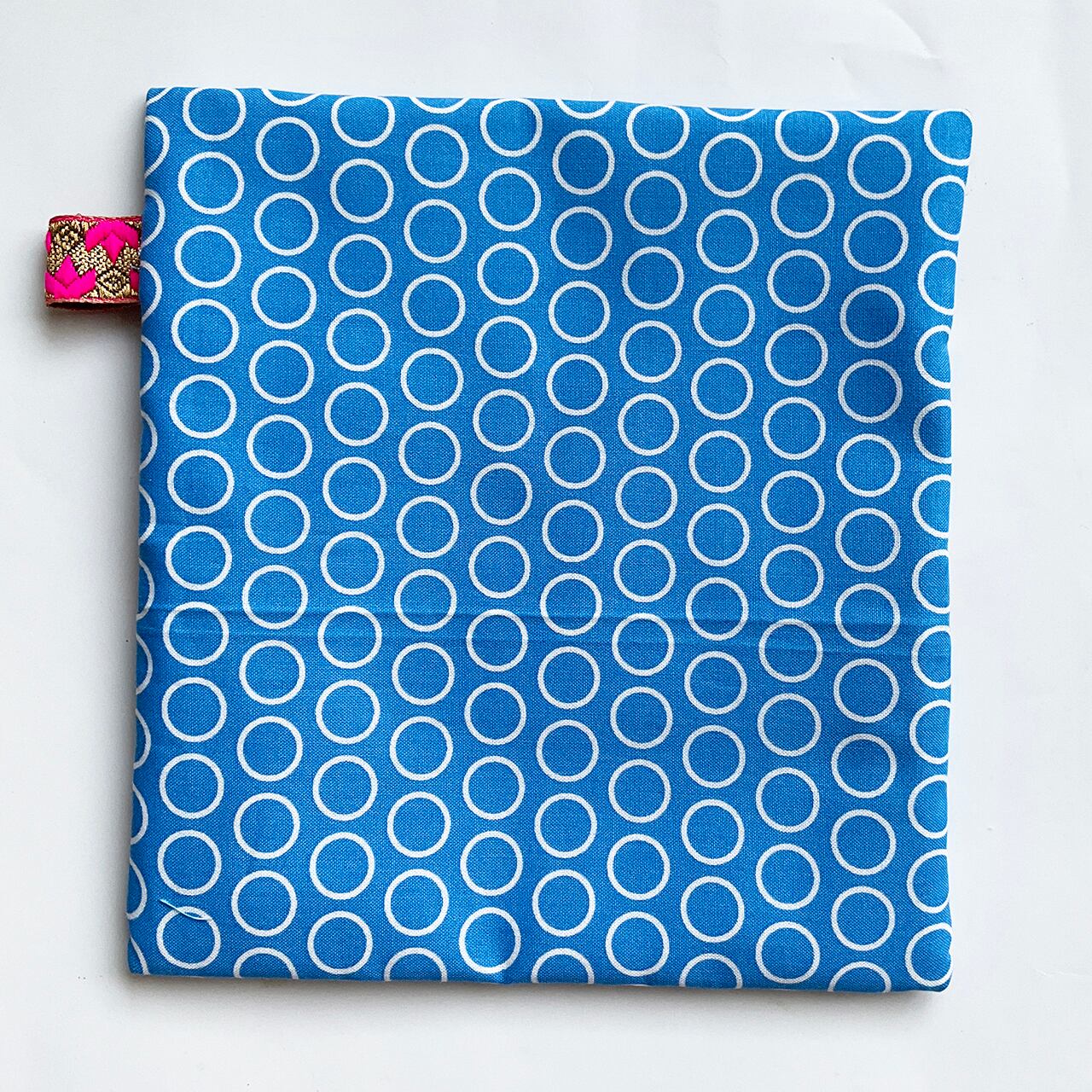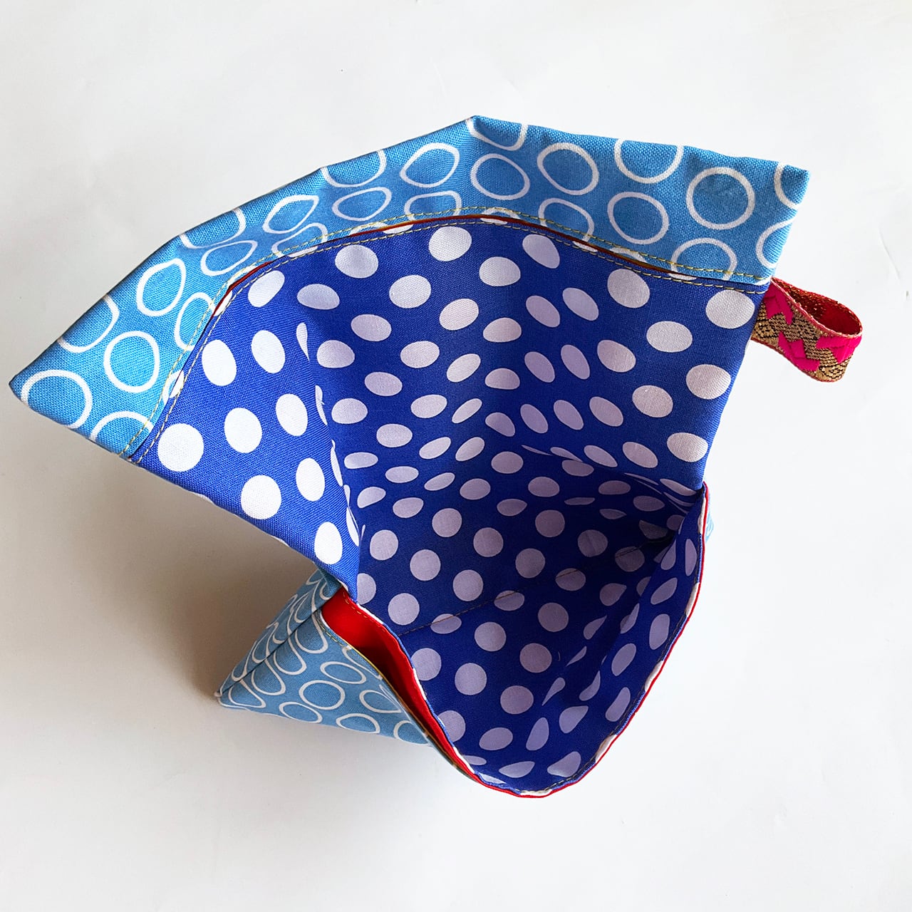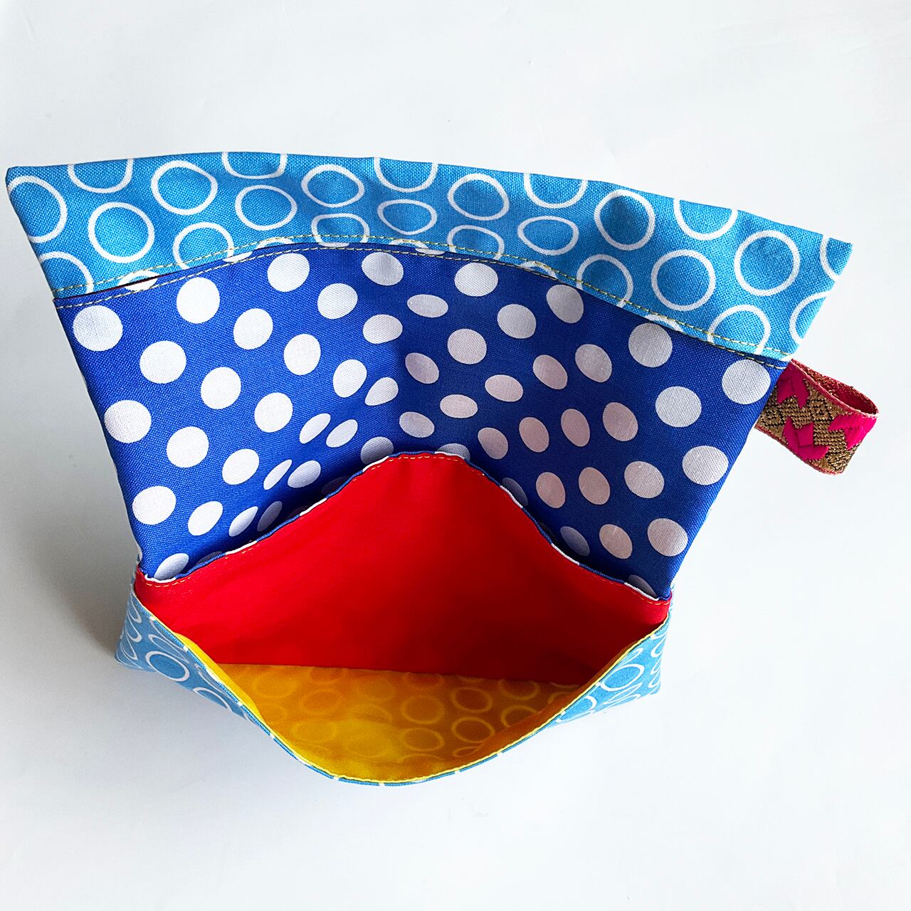 青に白い丸ラインのソリッドな布。青が好きな方。紐は青系でもいいですね。色数が少ないので、中布、インナーともに華やかで思い切りpopにしてみました。開ければ元気が出る一品になりました。水玉好きさんのためのヌノザイフ